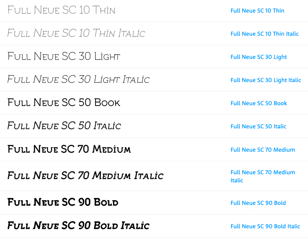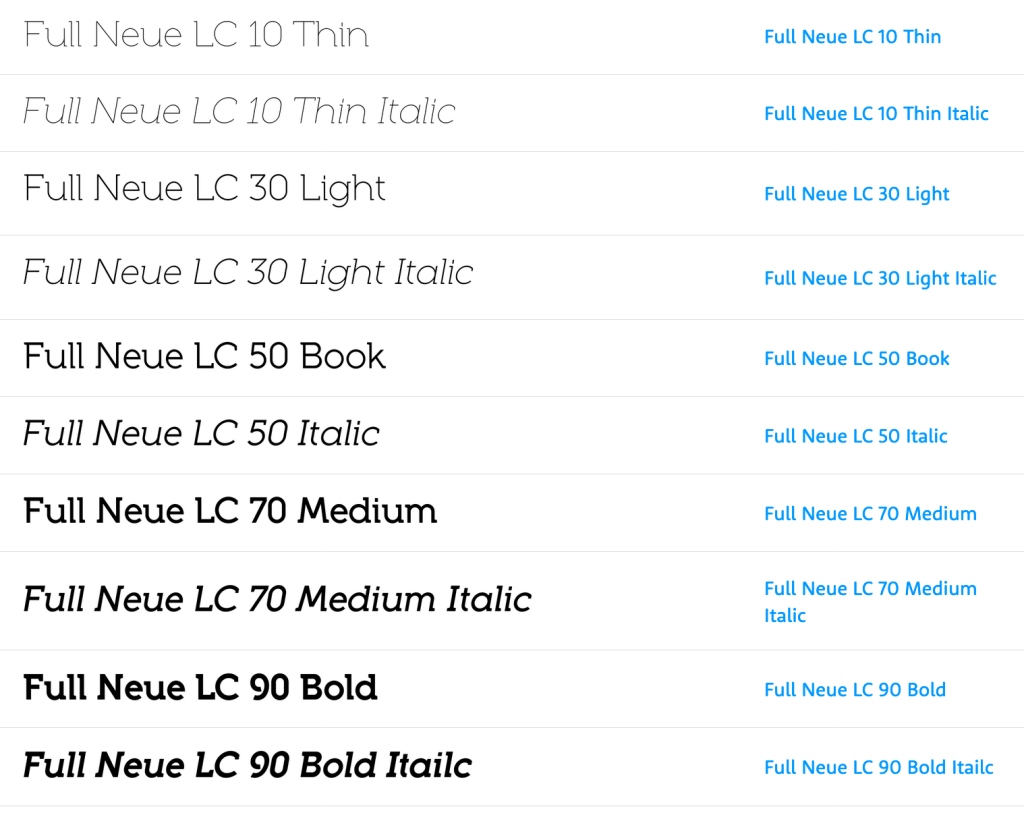 “Full Neue LC 50 Book” tanımı merkezi noktayı oluşturmaktadır. Sayının ilk rakamı kontur kalınlığını tanımlar: 10 İnce ila 90 Kalın. Full Neue LC 5 ağırlık ve italik olarak geliyor Full Neue SC 5 ağırlık ve italik toplam 20 tip geliyor. Aile 485 karakterden oluşan bir set içeriyor.