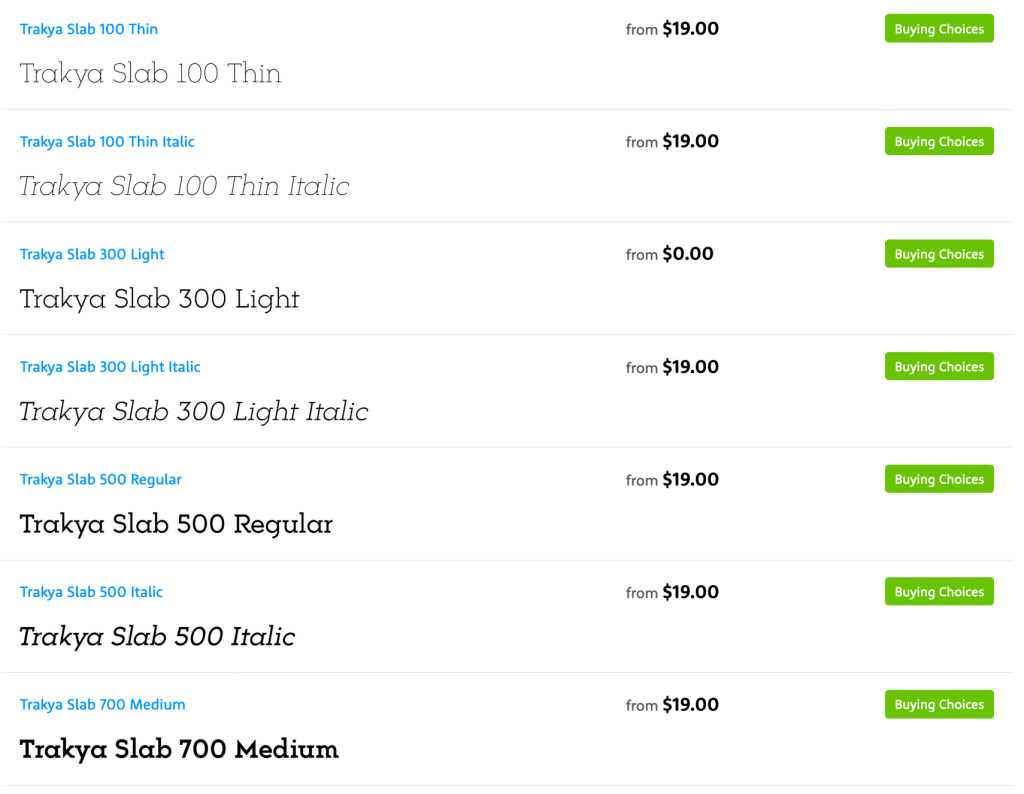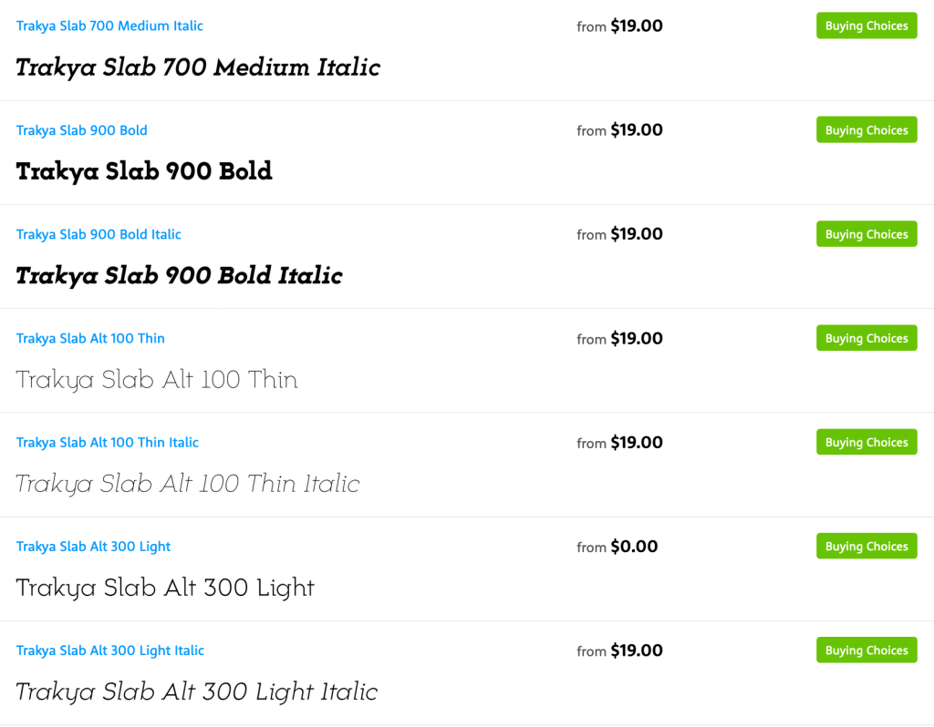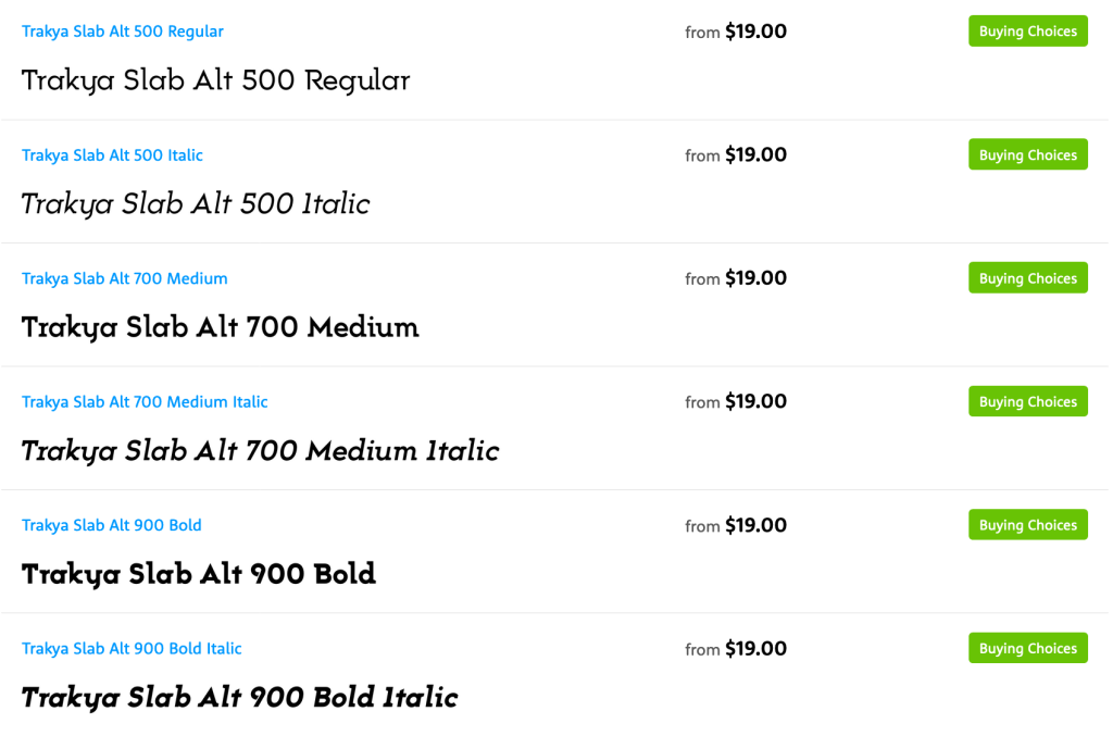 “Trakya Slab 500 Regular” ismi merkezi noktayı oluşturmaktadır. Sayının ilk rakamı kontur kalınlığını tanımlar: 100 İnce ila 900 Kalın. “Trakya Slab” 5 ağırlık ve italik ile geliyor; “Trakya Slab Alt” da 5 ağırlık ve eşleşen italik harflerle birlikte geliyor ve toplam 20 stil sunuyor. Aile, 630+ karakterden oluşan bir grup içerir.